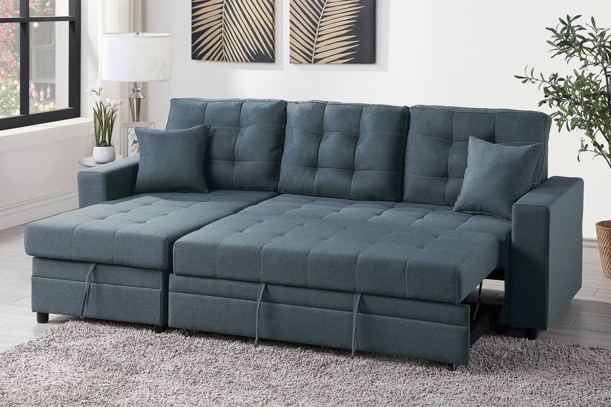 Relax, entertain, and rest on this 2-piece sectional with a simple design to fit a variety of living room styles. This unit features a modular structure covered in Blue Grey polyfiber with a pullout bed and a functional lower storage compartment.