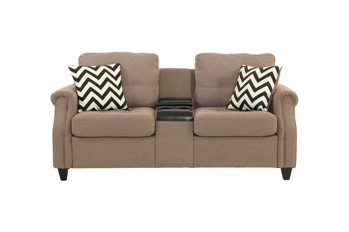If you want to give your living space a classic look, this stylish American-made sofa set that comes with the love seat is the perfect choice. Both the sofa and the love seat have two vibrant pattern pillows to contrast with the modest colors of the soft fabric. The loveseat includes a USB console and cupholders for you to relax and enjoy your down time while charging phones after a long day. Available in blue grey, light coffee, and dark coffee.
