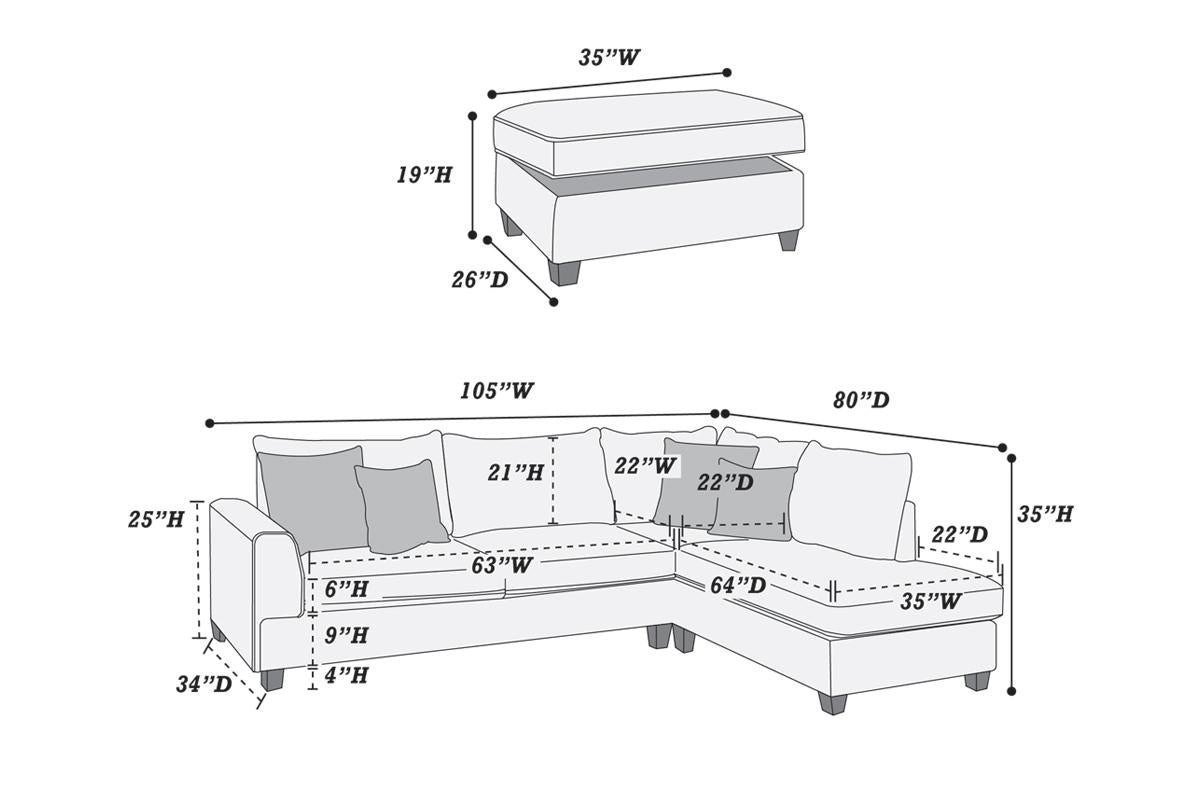 This beautifully designed sofa collection features a traditional crafted unit with large plush pillows and seating in summer hues. It also includes a reversible chaise and matching storage ottoman. Available in steel, light grey, or mocha Doric fabric.