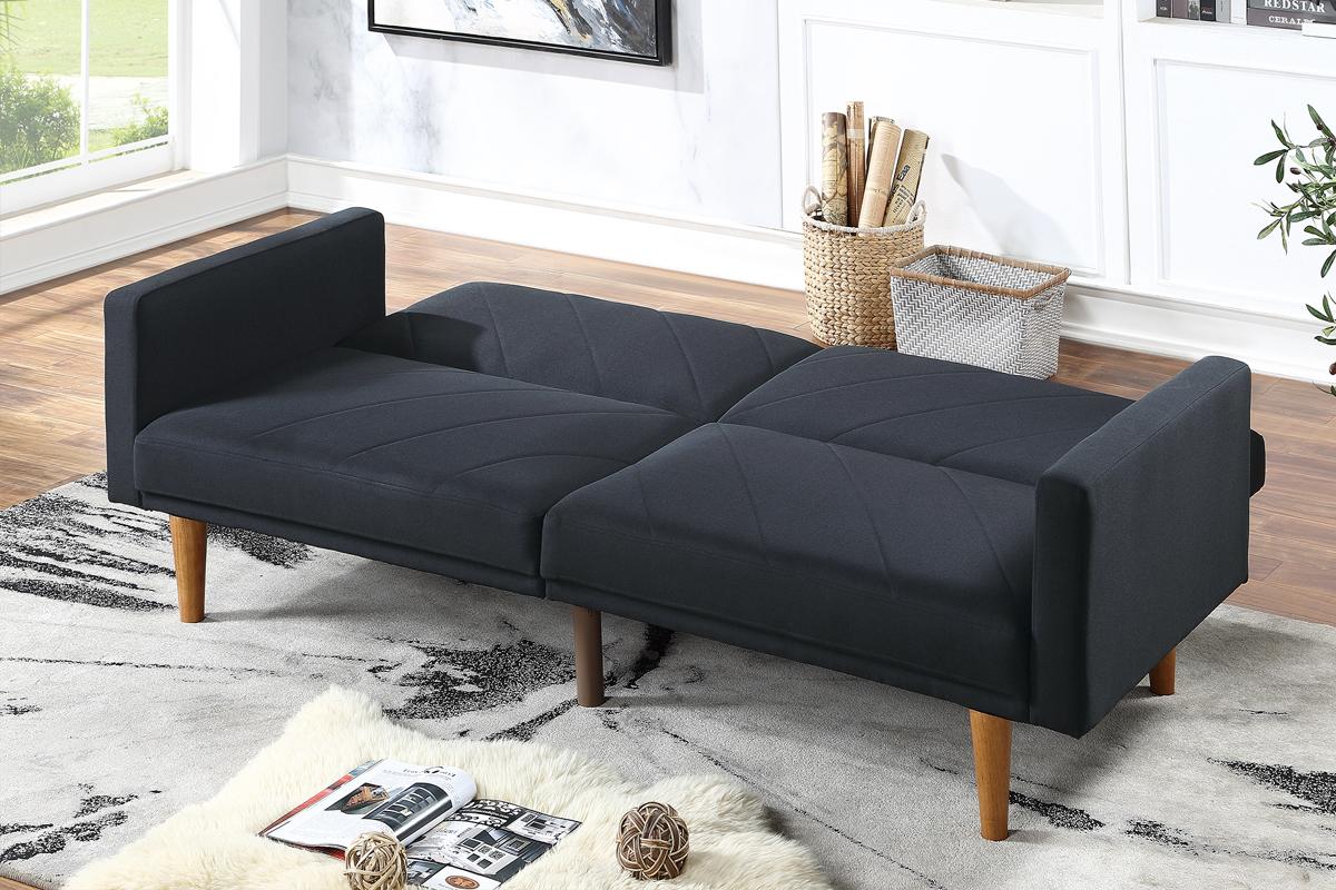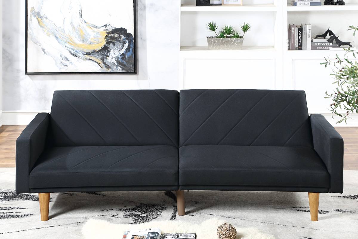 This minimal and modern adjustable sofa is a perfect choice to turn any space into a guest room. This American classic piece of furniture is made with soft fabric and its wooden leg support adds a natural look. Its versatility makes it suitable for any occasion. Available in black, mustard, and navy.