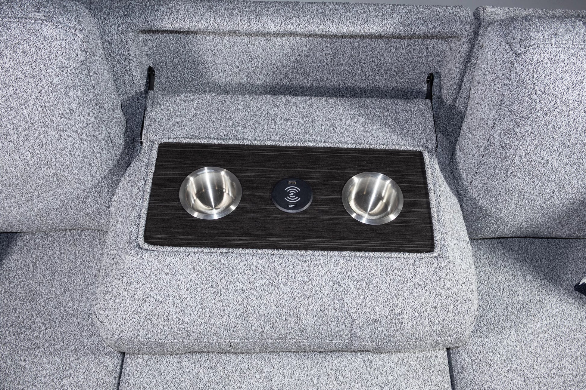 - Experience ultimate convenience with a backrest cushion that doubles as a fold-down table with wireless charging capability for your devices, and two cupholders to keep your favorite drinks in place and by your side while you lounge.