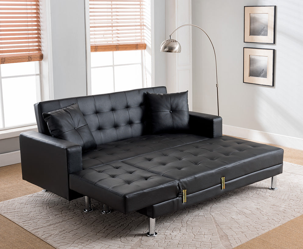 Features: Easily Converts into Bed; Reversible Chaise; Tufted Seat & Back; 2 Accent Pillows; Metal Legs Electroplated in Chrome