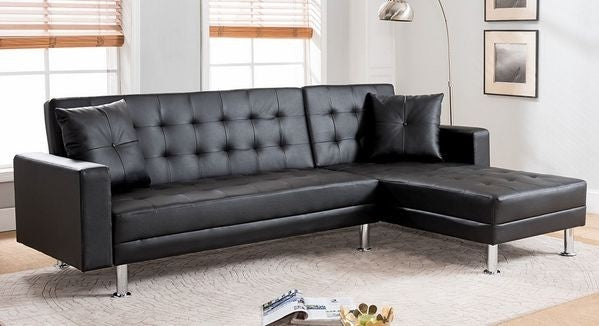 This contemporary style tufted back sectional sofa available in black. Add some swank and modern Hollywood glamor to your living room with this beautiful sectional sofa. Sleek lines coupled with button tufted back cushions make this piece work with a variety of interior styles. Constructed of solid wood frame it is features a stainless steel metal legs
